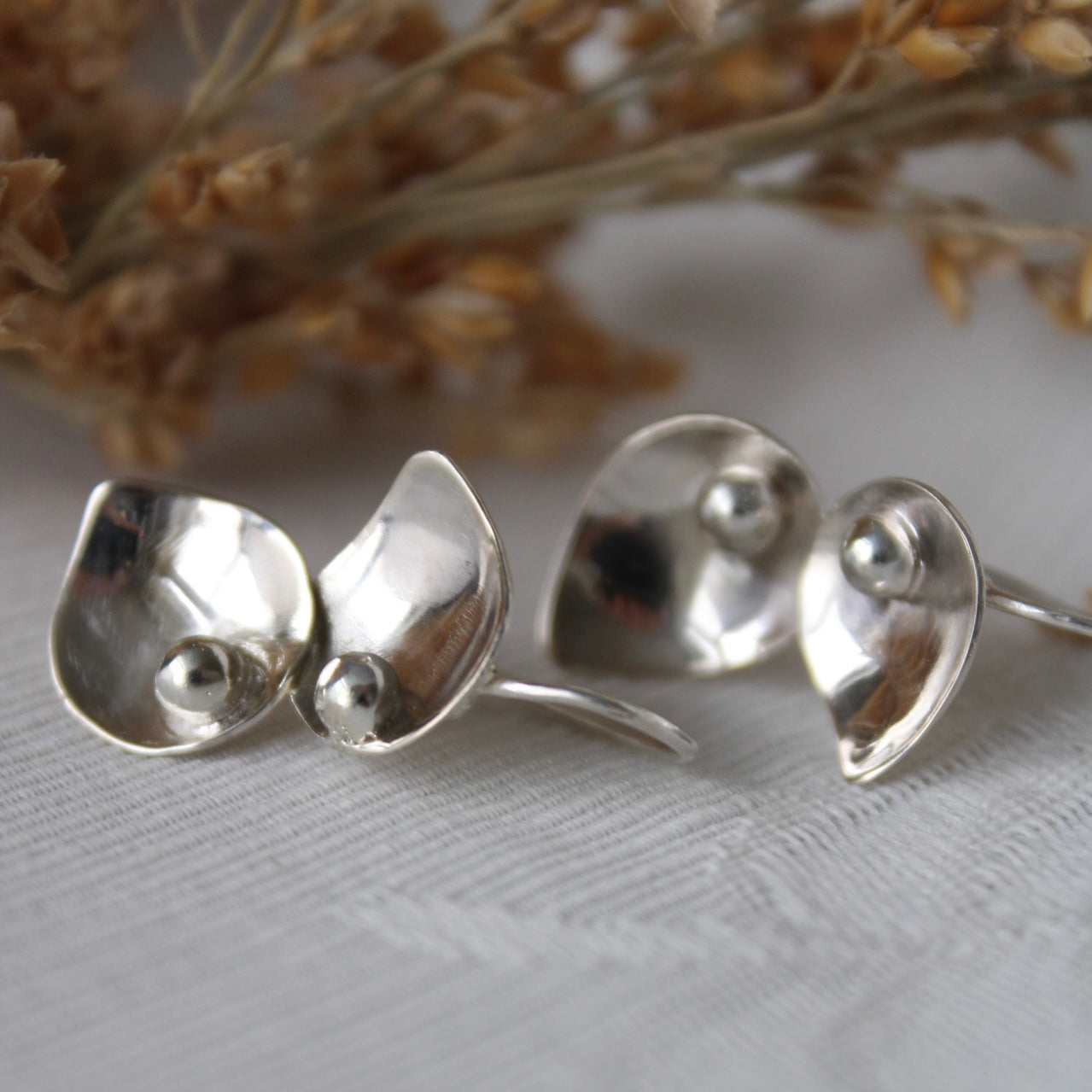 Delicately handcrafted in sterling silver, these earrings are inspired by the soft curves of magnolia petals. Each piece is sculpted by hand, embracing the organic beauty of nature in a timeless design. Their smooth, reflective surface captures the light with every movement — a subtle statement of elegance and craftsmanship.